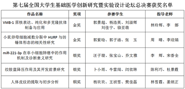12月3日至5日,第七届全国大学生基础医学创新论坛暨实验设计大赛总决赛在陕西西安顺利闭幕,beat3655个团队荣获金奖2个、银奖2个、铜奖1个,金奖及获奖总数均居全国第一,学校荣获优秀组织奖。