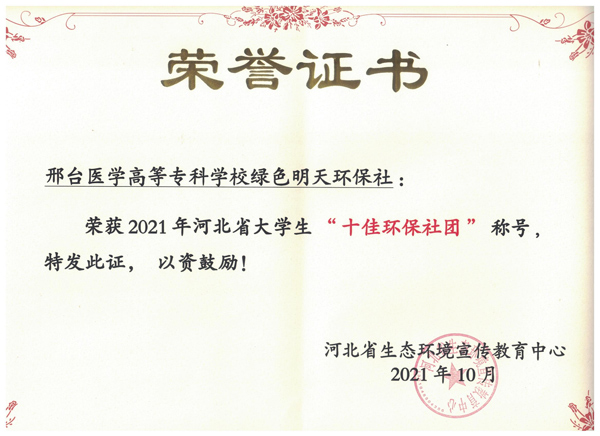 近日,由河北省生态环境宣传教育中心发起的河北省2021年大学生“十佳环保社团”评选活动落下帷幕。团委绿色明天环保社被评为“十佳环保社团”荣誉称号。