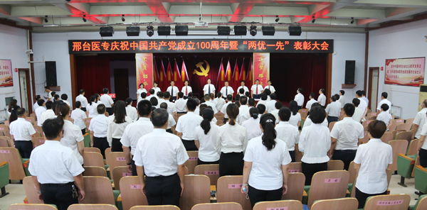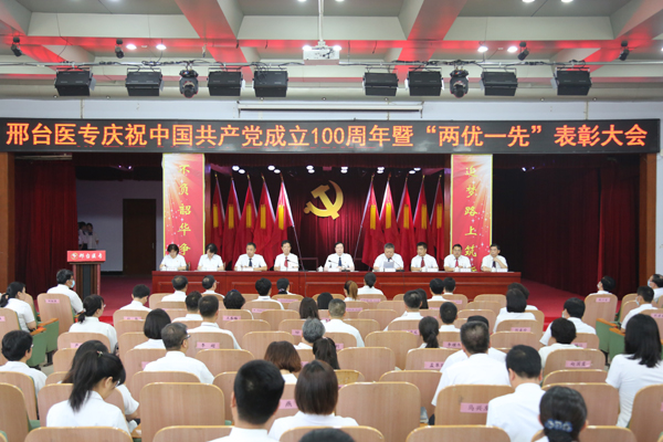 一百年红星闪耀,一百年党旗飘扬。6月30日下午,学术报告厅内党徽耀金,党旗艳艳,音乐迭起,笑脸盈盈,学校领导、中层正职以上干部、党支部书记、附属医院和老年养护中心领导以及市委教育工委、学校表彰的先进基层党组织、优秀共产党员、优秀党务工作者怀着激动的心情欢聚一堂,参加邢台医专庆祝中国共产党成立100周年暨“两优一先”表彰大会。党委书记田德荣作重要讲话暨讲专题党课,党委副书记、校长郑书深主持会议。