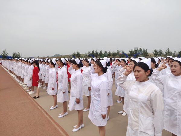 活动伊始,伴随着庄严的中华人民共和国国歌,鲜艳的五星红旗徐徐升起,全体师生在这一刻向国旗行注目礼,深怀对祖国无限的热爱和崇高的敬意。升旗仪式后,2019级普护3班勾跃然同学代表2019级全体学生发言,她表示身为医专学子无比自豪,继续传承护理事业、将毕生精力奉献给护理事业是医专学子义不容辞的责任。教师代表王静阐述了南丁格尔精神对培养学生良好职业道德和爱岗敬业精神的非凡意义,希望全体同学在学校“崇德、砺志、精业、笃行”的校训教导下,用实际行动践行南丁格尔誓言。随后,与会领导庄重而又深情地为55名即将走向实习岗位的2019级护理专业学生代表戴上圣洁的燕尾帽,冯志明老师带领全场学生在南丁格尔画像前庄严宣誓,“以救死扶伤,防病治病为己任,以自己的真心、爱心、责任心对待我所护理的每一位病人……”铮铮誓言中表达了同学们不辱白衣天使神圣使命的决心,青春的脸上写满了自豪和骄傲,激荡人心的南丁格尔誓言将激励学生为护理事业奋斗终身。