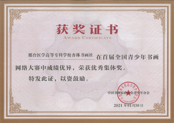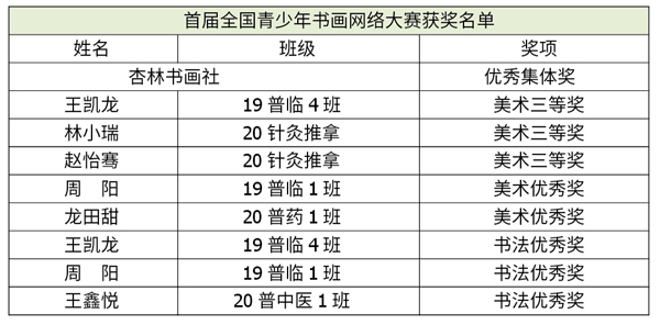 近日,beat365学生在首届全国青少年书画网络大赛中取得佳绩,其中,杏林书画社荣获优秀集体奖,3人次获美术三等奖、2人次获美术优秀奖、3人次获书法优秀奖。