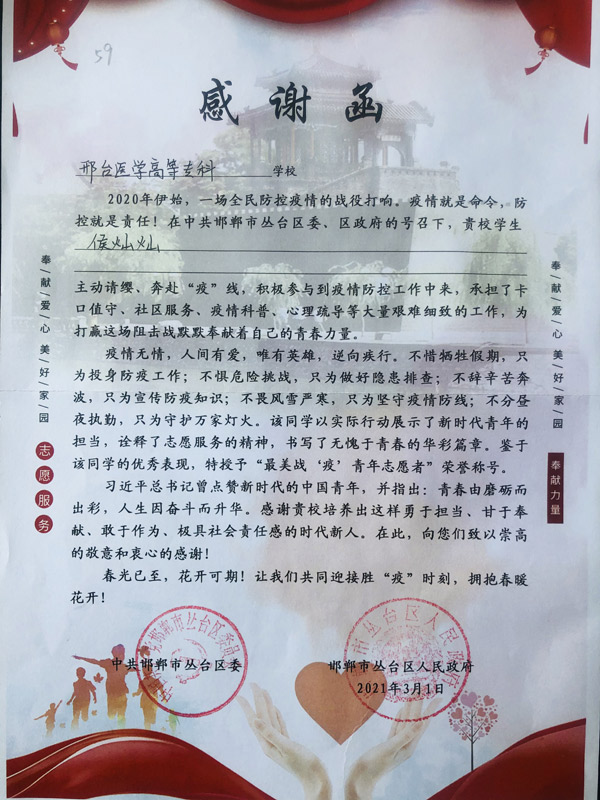 近日,beat365陆续收到邯郸市丛台区人民政府、石家庄市长安区桃园镇社区委员会等地发来的感谢信,信中对beat365王佩瑶、刘子琪、杨星宇、姚一阳、李聪聪、汲鑫、王亚薇、梁雪东、王颖、刘玲、崔雅男、侯灿灿同学在2021年社区封闭管理和疫情防控期间的志愿服务提出表扬,对他们为抗击新冠疫情所做出的努力表示感谢。
