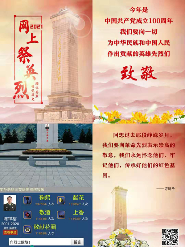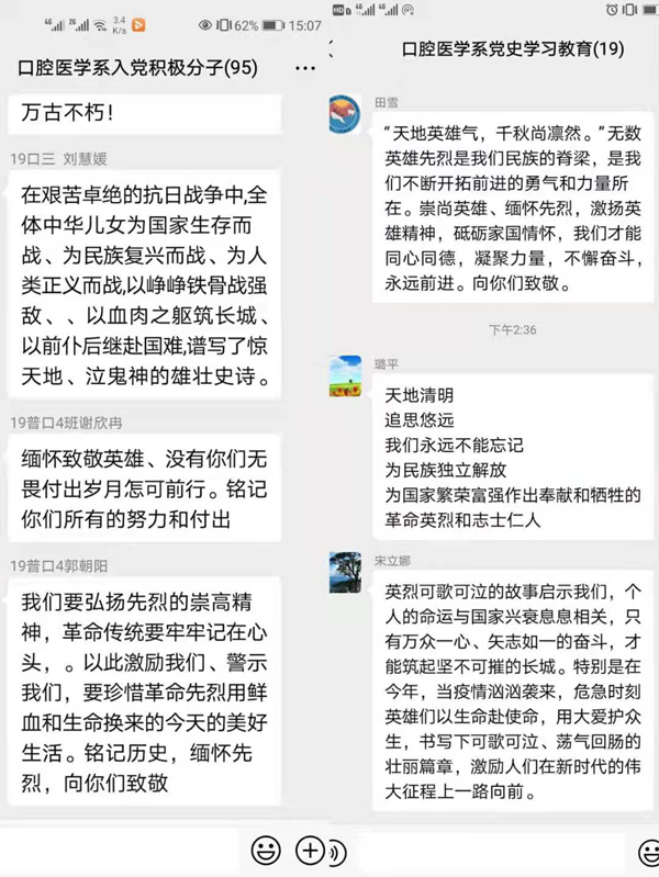在中华民族传统节日清明节之际,为继承先烈的革命精神,推进党史学习教育,4月3日至5日,口腔医学系党总支组织师生党员、发展对象、入党积极分子在“中华文明网”开展了“铭记党史,缅怀英烈”为主题的网上祭英烈活动。