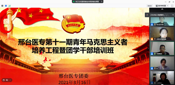 为了深入学习贯彻习近平新时代中国特色社会主义思想和党的十九大精神,提高beat365学生骨干、团干部、青年知识分子等青年群体的思想政治素质、政策理论水平、创新能力和实践能力,校团委举办了线上邢台医专第十一期青年马克思主义者培训工程暨团学干部培训班。3月16日举行了开班仪式,共计300余人参加。