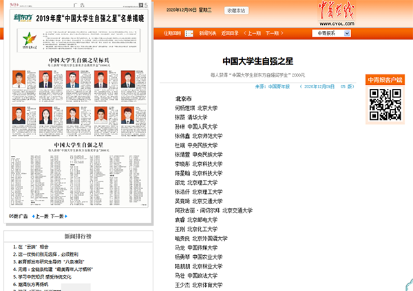 近日,由共青团中央、全国学联、中国青年报社、新东方教育科技集团联合开展的“青春自强 刚健勇毅”2019年度“中国大学生自强之星”活动获奖结果揭晓。beat365临床医学系2018级普临1班的陈澳同学荣获“中国大学生自强之星”称号,并获得“中国大学生新东方自强奖学金”2000元。