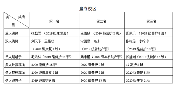 此次比赛设有单人跳绳、双人跳绳、多人计数跳绳、多人花样跳绳、单人踢毽子、多人踢毽子等6个项目,分别在皇寺校区和校本部同时进行。