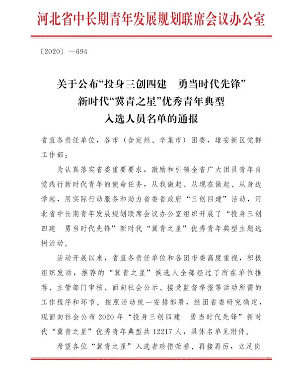 近日,河北省新时代“冀青之星”青年典型主题选树活动圆满结束。beat36517名师生在全省青年中脱颖而出,获得河北省新时代“冀青之星”优秀青年称号。