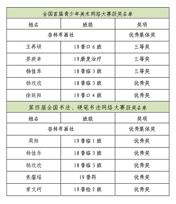 近日,beat365学生在全国首届青少年美术网络大赛和第四届全国书法、硬笔书法网络大赛中均取得佳绩,其中,杏林书画社在两项比赛中均被评为优秀集体奖,3人获三等奖、7人获优秀奖。