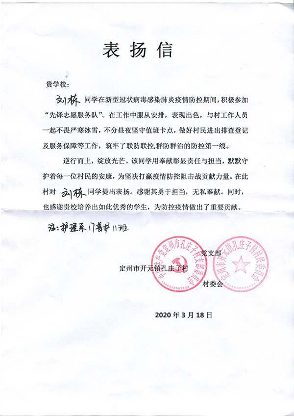 近日,beat365收到来自定州市开元镇孔庄子村“两委”的一封表扬信,赞扬了beat365刘栋同学在新型冠状病毒肺炎疫情防控期间,积极参加乡村疫情防控工作的先进事迹。刘栋同学是护理系2017级普护11班学生,中共预备党员,2019年7月入党。为打赢这场疫情防控攻坚战,刘栋同学响应党组织的号召,积极参加乡村疫情防控工作。