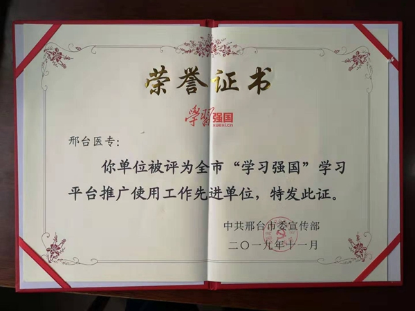 12月19日,在市委宣传部开展的“学习强国”学习平台学习推广使用工作先进评选中,beat365荣获邢台市“学习强国”学习平台推广使用先进单位,赵贵栋同志荣获“学习强国”学习平台推广使用工作先进个人(学习之星)。