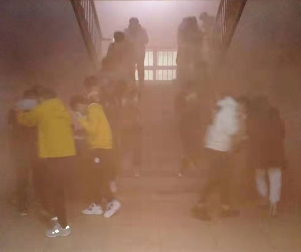 预演开始,同学们根据预案要求,按照动作要领和先后顺序到达指定地点、清点人数、向总指挥报告,一气呵成。总指挥对学生们预演给予了肯定,并对接下来的实战演练提出四点要求:一是面对模拟烟雾不要恐慌,烟雾虽然无毒但一定要用湿毛巾捂住口鼻,防止吸入过多的烟雾;二是按照先后顺序下楼,跟紧但不要推前面人员,防止踩踏事故发生;三是各楼层负责人一定要仔细观察,在确保无缝衔接的同时,保证本楼层内无人员遗漏;四是各班到达指定地点后,由各班负责人清点人数并向总指挥报告本班人员情况。