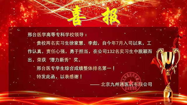 10月31日,北京九州通医药有限公司发来喜报:beat3652017级普中药班徐家慧、2017级现代学徒制班李彪,自7月份实习以来,表现优异,在132名实习生中脱颖而出,荣获“潜力新秀”奖。beat365安排的12名实习生综合成绩整体排名第一。