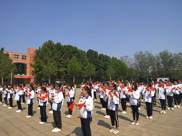 中午12点30分,国旗护卫队迈着矫健的整齐划一的步伐来到图书馆广场,在庄严的国歌中五星红旗冉冉升起,随后百余名学生代表高唱共青团团歌《光荣啊!中国共青团》,用歌声唱出了青年人同祖国共奋进的激昂。学生代表、校团委宣传部部长2018级普药1班张兰馨同学在国旗下做了题为《我与我的祖国》的演讲,校团委网络部部长2018级普检1班王云菲同学带领同学们重温了入团誓词。校团委书记杜庆岩在总结讲话中,希望同学们提升思想,磨炼意志,用奋斗、用担当、用奉献、用爱国铸就人生品格,强化使命担当,树立远大理想,将满腔爱国赤诚和永不止步的学习奋斗,一起写进追梦的历程。最后,全体同学共同高歌《我和我的祖国》,为新中国成立70周年送上最美好的祝福。