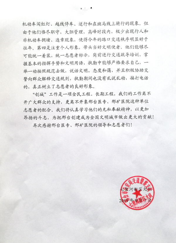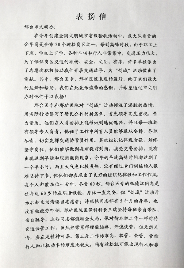 信中写到:邢台医专对创城活动倾注了满腔热情,用实际行动谱写了警民合作的新篇章。首先领导高度重视,每一班都有专人负责,所有人员服从安排,尽职尽责。第二是组织纪律观念强,始终坚守岗位,每班提前到岗,接受交警安排,从无迟到早退和脱岗漏岗现象,在位一分钟,尽责60秒。第三是工作标准高,敢管、会管。管控行人和非机动车难度大,稍有放松就可能出现行人和非机动车闯红灯、越线停车、逆行和在斑马线骑行的现象。但邢台医专志愿者恪尽职守,大胆管理,高峰时段内,极少出现行人和非机动车拥堵、违章现象。第四是注重个人形象,带头当好文明使者。邢台医专志愿者着装规范,说话文明,态度和蔼,并积极协助交警向群众解释交通规则,真正树立了志愿者的良好形象。信中还提到了创建全国文明城市省级验收期间,学校中医系年近60岁的甄德江教授、怀孕五个月的许照艳老师仍积极参加交通协管,实在是精神可嘉。