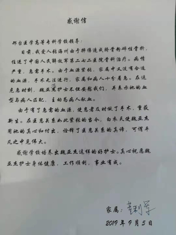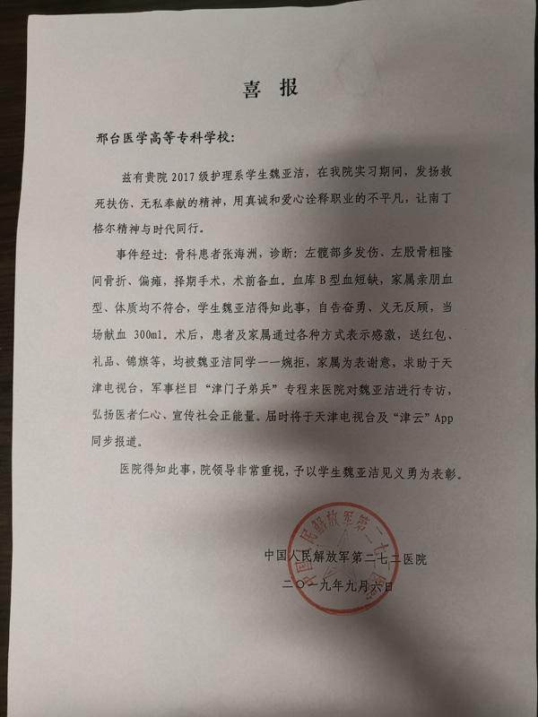 近日,解放军272医院发来喜报,对beat3652017级护理系实习生魏亚洁同学为他人奉献爱心的先进事迹给予表彰,同时,家属也发来感谢信,对魏亚洁同学表示感谢。