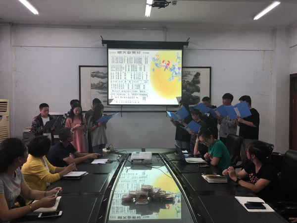 活动中,学生代表们首先合诵了《师说》《老师颂》等篇目,表达了对所有老师的深深祝福。之后师生分别演绎了张若虚的《春江花月夜》、张九龄的《望月怀远》等脍炙人口的诗词名篇, 他们用优美洪亮的声音表达中秋思乡团圆之情。图书馆老师给学生发了香甜的月饼,同时为大家深情演唱了《月亮代表我的心》《但愿人长久》等唯美歌曲,送上祝福。随后,师生共同诵读了《祖国啊,我亲爱的祖国》《我骄傲,我是中国人》等经典诗文,从不同层面、不同角度回顾了新中国成立70周年来的光辉历程,表达了对党和祖国的热爱之情。最后,师生们合唱《明天会更好》,以满腔热情祝福祖国在新时代社会主义建设中激扬奋进、再创辉煌。