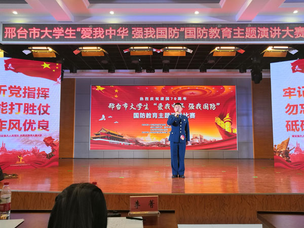 为深入贯彻落实党的十九大精神,扎实开展高校国防教育工作,5月30日,由中共邢台市委宣传部、邢台市教育局、共青团邢台市委、邢台军分区动员处和邢台军分区政治工作处共同主办的庆祝新中国成立70周年邢台市大学生“爱我中华•强我国防”主题演讲比赛在邢台市特殊学校礼堂举行。经过校内选拔,beat365选派6组选手、共12名同学参赛。
