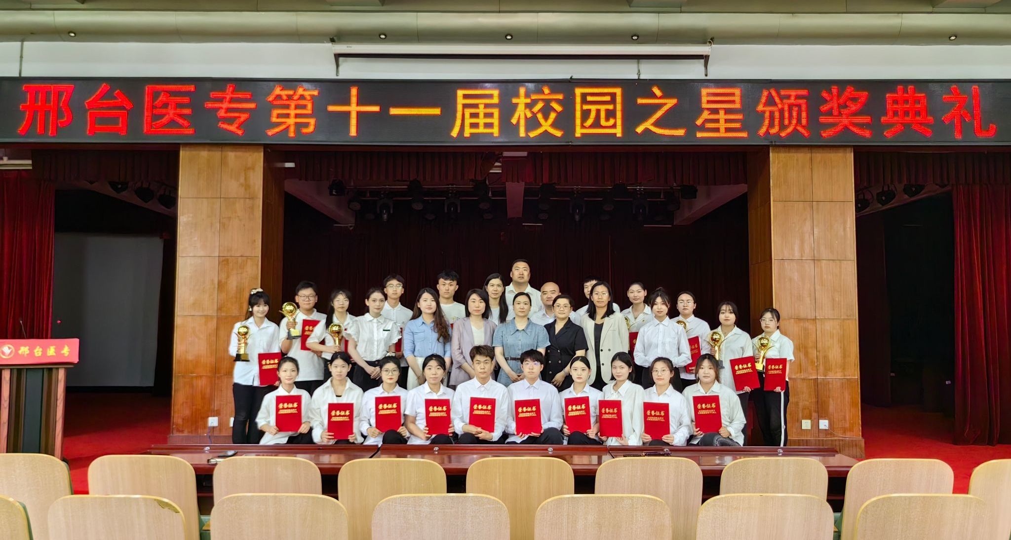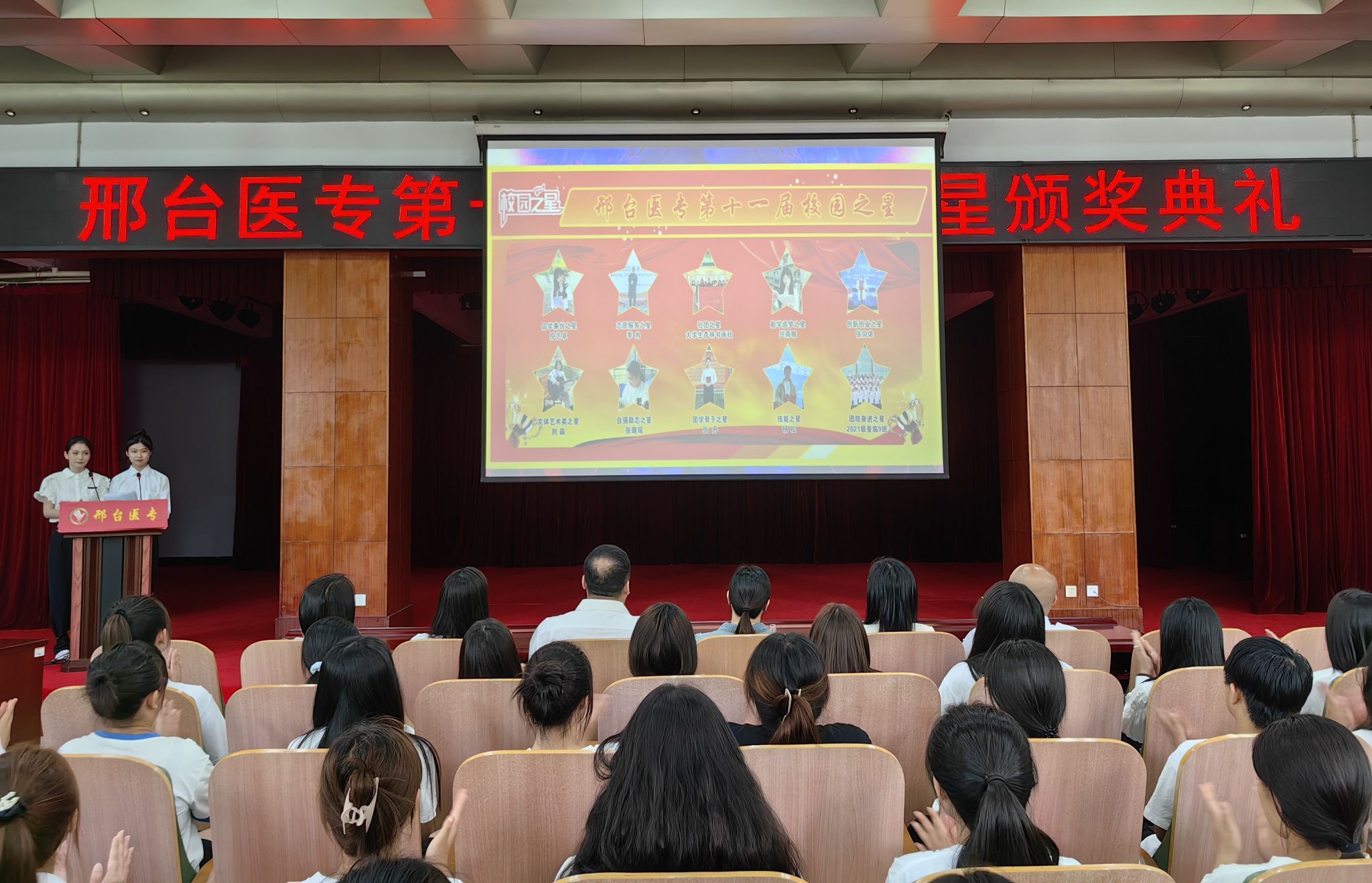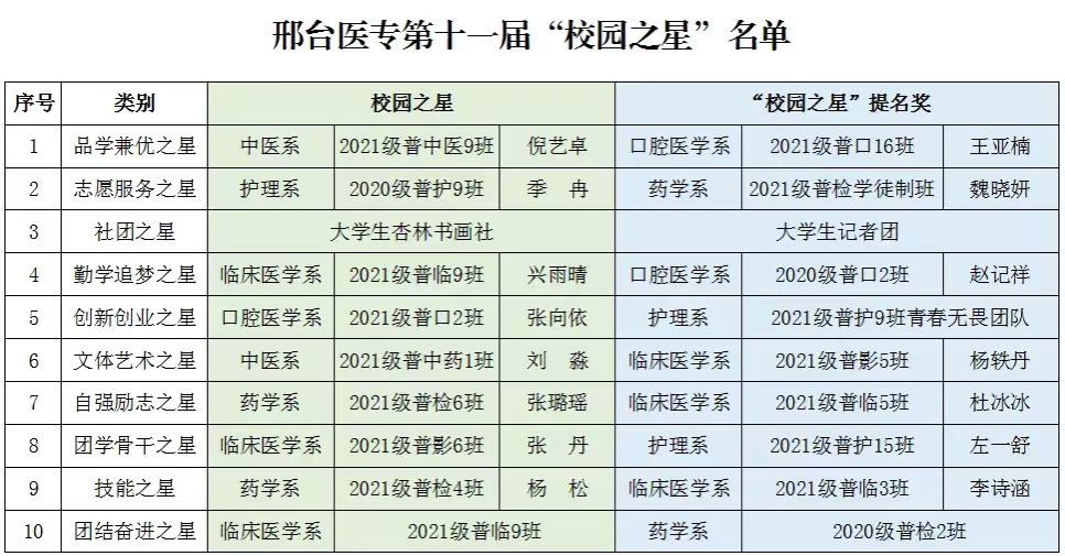 获得本届“校园之星”的是:善思笃行、积极进取的“品学兼优之星”2021级普中医9班倪艺卓;传递温暖、奉献爱心的“志愿服务之星”2020级普护9班季冉;笔墨寄情、书画言志的“社团之星”大学生杏林书画社;笃实好学、切问精思的“勤学追梦之星”2021级普临9班兴雨晴;慎终如始、锐意进取的“创新创业之星”2021级普口2班张向依;落落大方、执着追梦的“文体艺术之星”2021级普中药1班刘淼;坚韧不拔、积极乐观的“自强励志之星”2021级普检6班张璐瑶;勤勉实干、力学笃行的“团学骨干之星”2021级普影6班张丹;检以求真、验以养德的“技能之星”2021级普检4班杨松;携手拼搏、同心奋斗的“团结奋斗之星”2021普临9班。