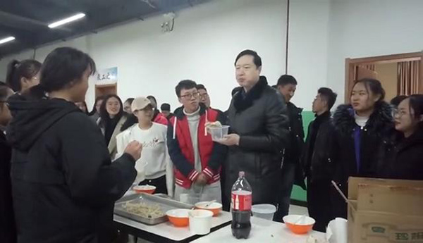 正当社员们吃着热汽腾腾的饺子,沉浸在暖暖的幸福之中时,有学生喊了一句“田书记来了”,同学们都激动的站起来,“田书记好”“田书记新年好”……现场的气氛一下子热烈起来,室外气温已经达到零下,而室内却感觉春意盎然。正在查看食堂放假期间服务情况的学校党委书记田德荣来到活动现场,和社员们亲切交谈,向同学们致以新年的亲切问候与美好祝福,并嘱咐同学们少玩手机多读书,通过开展活动引导更多的学生融入社团,社员之间要互相关心,共同进步。随后,田书记品尝了社员们包的饺子,称赞饺子好吃的同时又叮嘱学生们一定要注意食品安全。包饺子活动让社员们体验了劳动的乐趣,驱散了乡愁;田书记的到来,让每一位参与其中的社员在新年到来之际感受到了家的温暖和长者的厚爱。