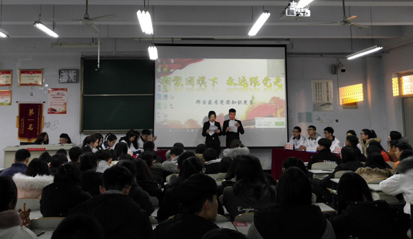 12月11日,学校团委举办的“相聚团旗下,永远跟党走”党团知识竞赛在阶梯教室举行。200余名团学骨干、学生代表观看了比赛。
