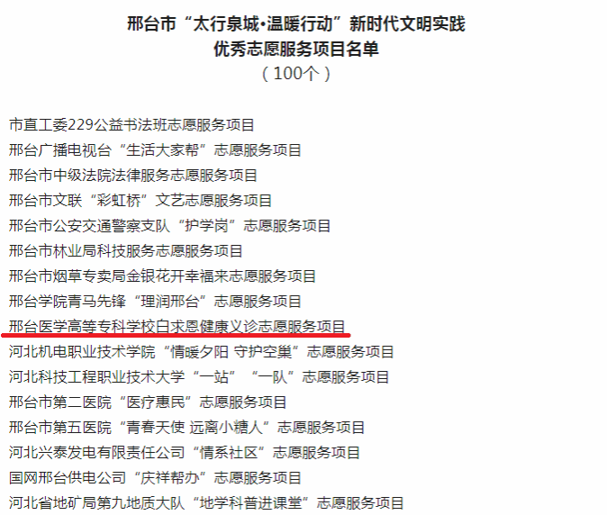 近日,邢台市委宣传部公布了“太行泉城·温暖行动”新时代文明实践优秀志愿服务项目名单,beat365“白求恩志愿服务队进社区健康义诊”项目获评!