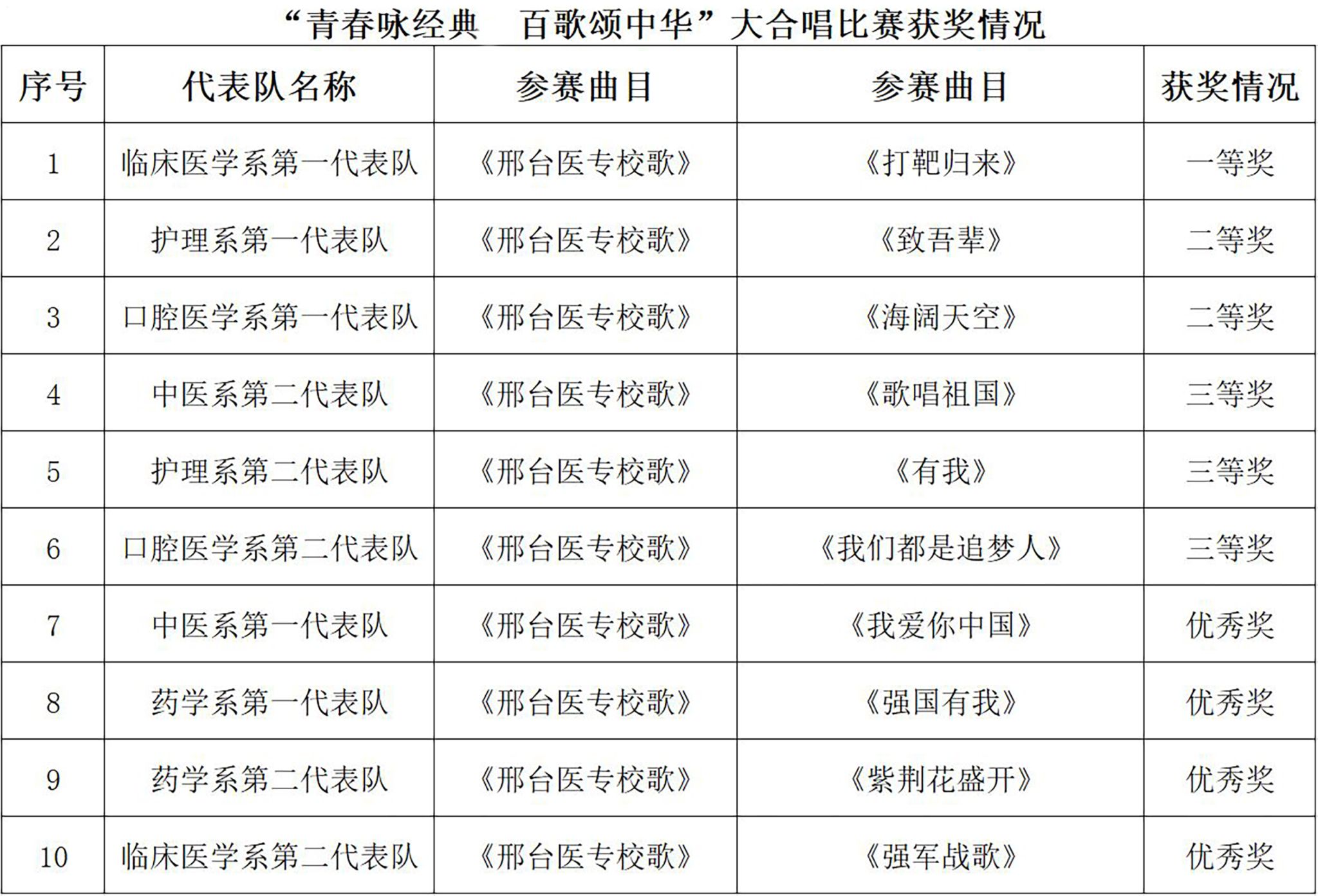 在雄壮有力的《强军战歌》中,“青春咏经典 百歌颂中华”大合唱比赛决赛正式开始。经选拔,共10支代表队入围此次决赛,各代表队分别演唱了必选曲目《邢台医专校歌》和一首自选“红歌”,同学们统一的着装,嘹亮的歌声,充分展现了beat365青年学子昂扬向上的精神面貌。经过激烈角逐,最终临床医学系第一代表队摘得桂冠。