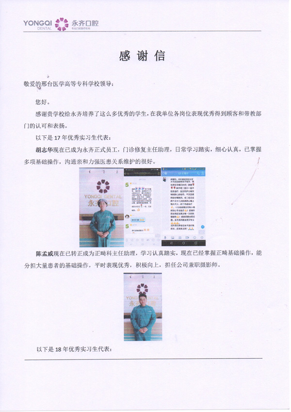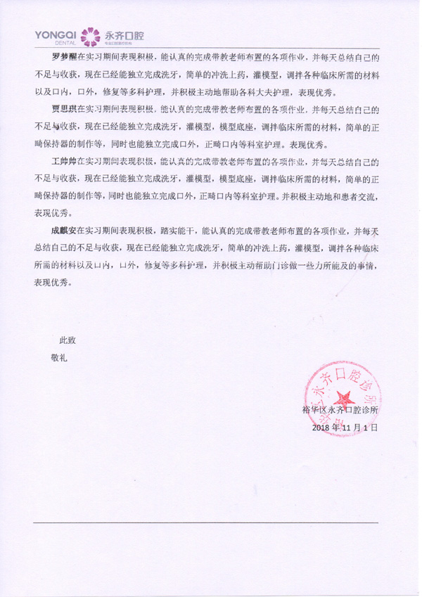 近日,石家庄永齐口腔诊所来信对beat3652016级实习生罗梦醒等4名学生在实习期间优异表现提出表扬。同时,对在该单位实习并留用的2015级学生胡志华、陈孟威2名同学踏实认真、勤奋好学的工作态度高度赞赏。
