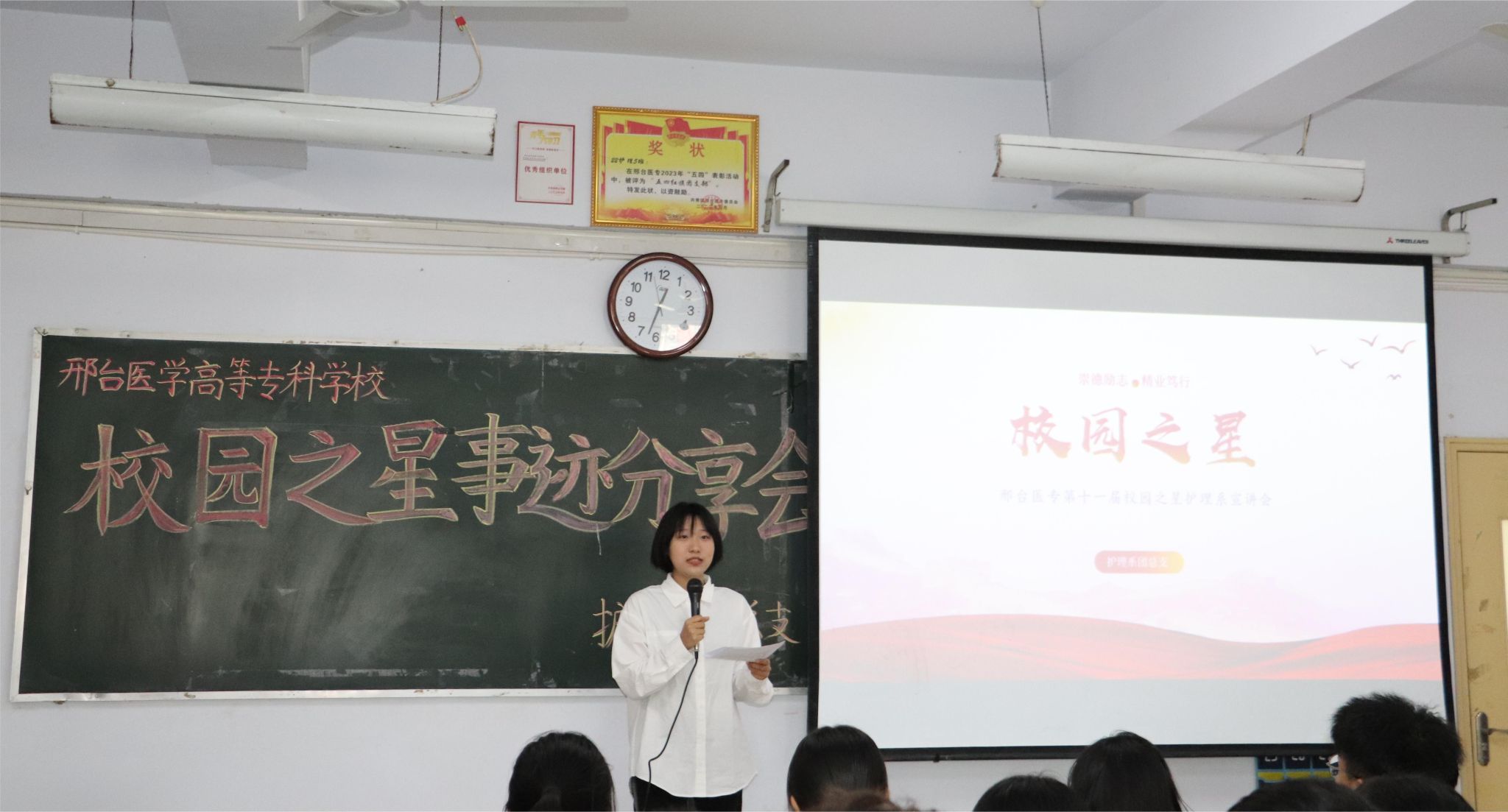 分享会上,大家共同学习了校园之星的先进事迹。积极参加活动、各项成绩优异的“品学兼优之星”——口腔医学系员桥同学;传递温暖、奉献爱心的“志愿服务之星”——护理系季冉同学;将责任担当铭记于心、付诸于行的“团学骨干之星”——临床医学系张丹同学;笃行好学、刻苦钻研的“勤学追梦之星”——临床医学系兴雨晴同学;精益求精、用专业技能书写青春新篇章的“技能之星”——药学系杨松同学;意志坚强、乐观面对挑战的“自强励志之星”—— 药学系张璐瑶同学,还有荣获2022年“挑战杯”河北省大学生创业计划竞赛一等奖的创新创业之星——2021级护理9班青春无畏团队……一个个先进的事迹让在场的同学们都备受鼓舞。同学们也纷纷表示要从榜样身上汲取力量,争做奋发有为、创先争优、立志成才的新时代好青年。
