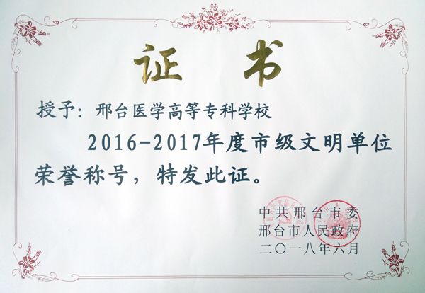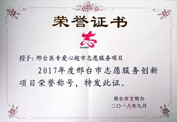 近日,beat365被中共邢台市委、邢台市人民政府授予“2016-2017年度市级文明单位”荣誉称号,邢台医专爱心超市志愿服务项目被邢台市文明办授予“2017年度邢台市志愿服务创新项目”荣誉称号。