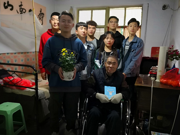 同学们以前了解到郭大爷最近想看一本《脑力全开》的书,于是就跑遍了各大书店为他挑选了一本,当老人捧过这本书时,非常高兴。2017级普临2班房蕊妍同学精心为郭大爷准备了一幅写有“积学储宝”的毛笔字幅送给老人,赞誉老人爱学习、好积累的精神品质,也勉励同学们一定要向郭大爷学习。同学们还带来了一盆漂亮的菊花与老人共赏,郭大爷一时兴起还拉着同学们的手吟起了王维的《九月九日忆山东兄弟》。吟完诗后,老人激动地说:“你们都是我的亲人,每个节日你们都陪我度过,有你们我很幸福,谢谢你们”。随后,同学们还推着老人晒太阳,给轮椅打气、打扫厨房,最后,同学们还从邻居家借来了铁锹等工具将老人门口的台阶修缮成坡道,方便了老人的出行。