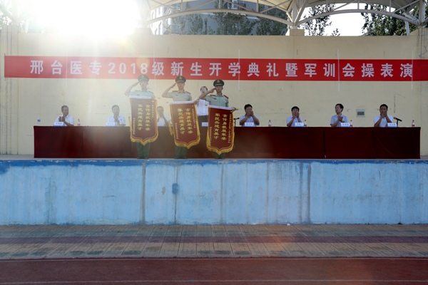 在《邢台医专校歌》声中,开学典礼落下帷幕,各新生班进行了军训会操表演。2018级新生在教官的指挥下,迈着坚毅的步伐,喊着嘹亮的口号,军容严整、意气风发、英姿飒爽,以最高昂的士气、最威武的军姿、最整齐的队列,依次走过主席台,展现出朝气蓬勃、奋发向上的青春风采和精神风貌,赢得了在场师生们的赞誉。