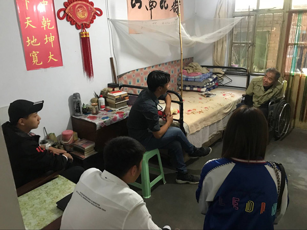与往常一样,同学们来到郭大爷家就开始忙碌起来了,为老人打扫院子,整理房间,扫地拖地,擦窗户玻璃,不一会儿就把郭大爷的家收拾得干干净净。之后,同学们和老人一边品尝着月饼,一边聊天,从古代历史聊到当今时事,郭大爷知识面广而且还很健谈,在他的床头柜上整齐的摆放着各式样的书,让人印象最深刻的是一本《达芬奇密码》,郭大爷说:“人最需要的东西,是智慧,而获得智慧的方式就是多读书,从书中汲取养分。”通过交流,同学们感受到郭大爷虽然身体残疾,然而他乐观阳光的生活态度、积极向上的学习精神,值得每一个人学习。