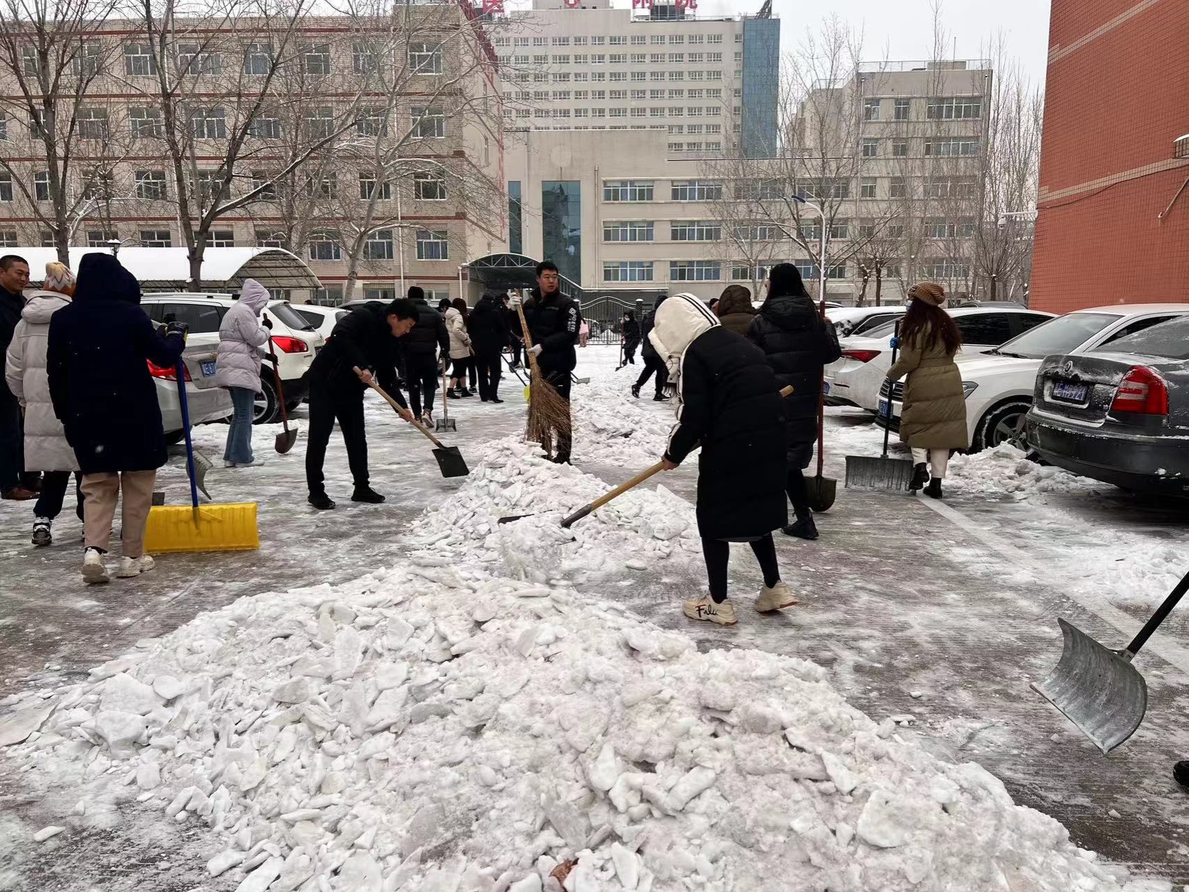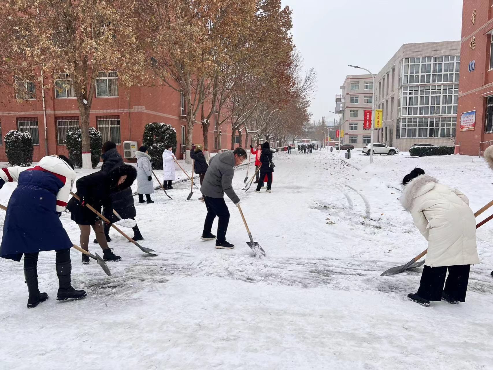 活动中,大家不惧严寒、不辞辛苦,个个精神抖擞,干劲十足,雪锹翻飞,扫帚舞动,铲、推、扫,行动迅速、配合默契,尽管大家的脸、手冻得通红,但丝毫没有停歇,在铲雪过程中老师们还不忘相互提醒注意防滑,场面温馨有爱,忙碌的身影构成了一道亮丽的风景线。经过两小时的辛勤奋战,学校门口、教学楼周围和图书馆前等主干道的积雪均被清理干净,为全校师生开辟了洋溢着温暖和关爱的安全之路。