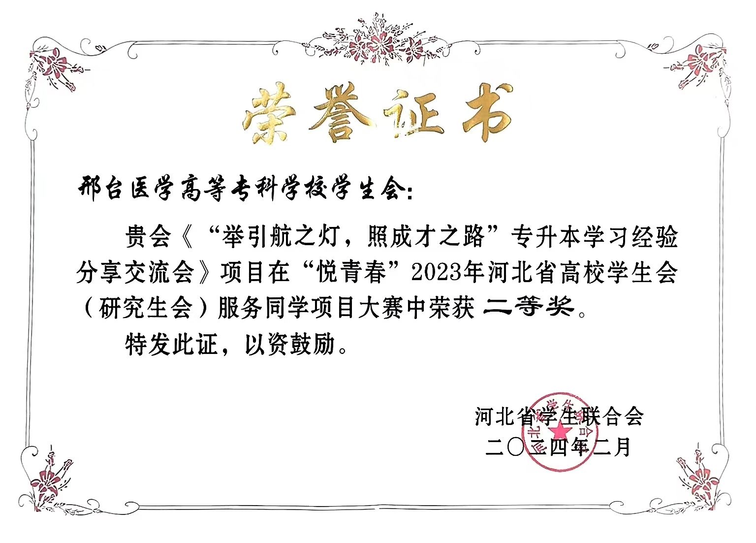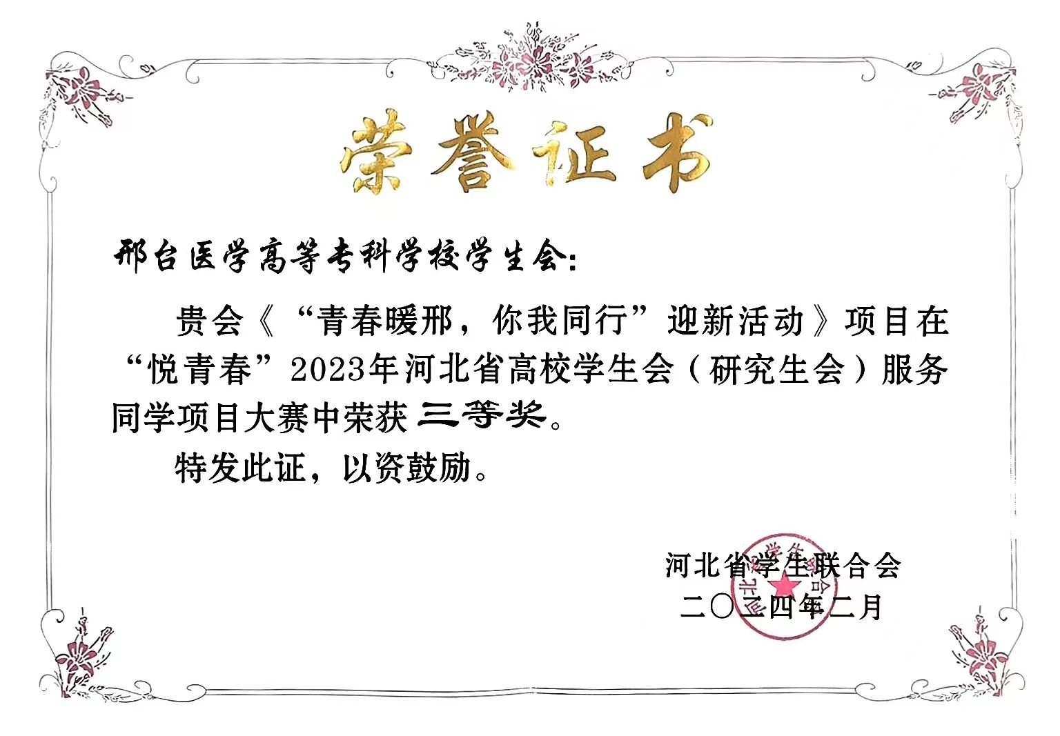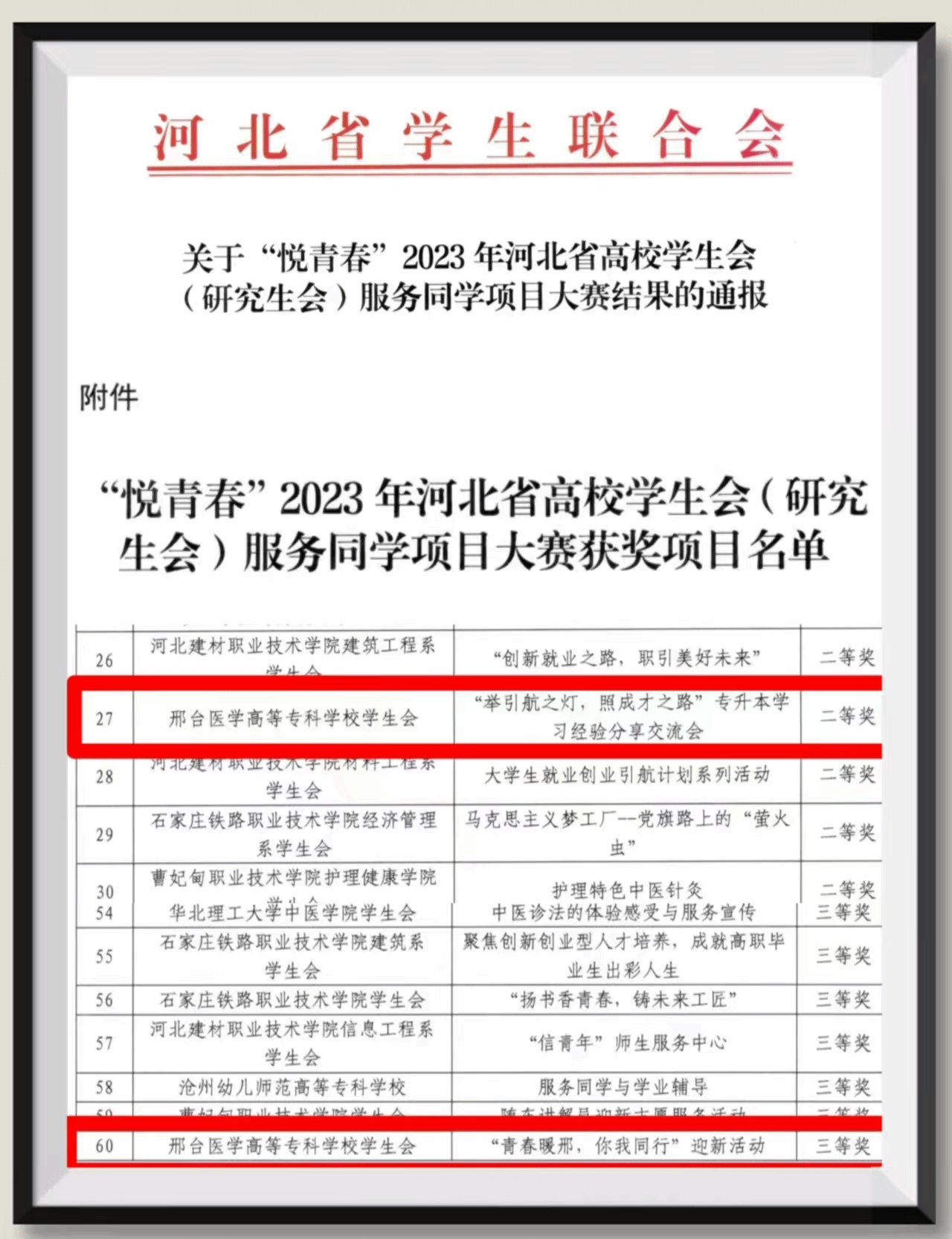 近日,河北省学生联合会“悦青春”2023年河北省高校学生会(研究生会)服务同学项目大赛结果公布,beat365推报的2个项目全部获奖:《举引航之灯,照成才之路”专升本学习经验活动》项目荣获二等奖,《“青春暖邢,你我同行”迎新活动》项目荣获三等奖。beat365为邢台地区唯一获奖高校。