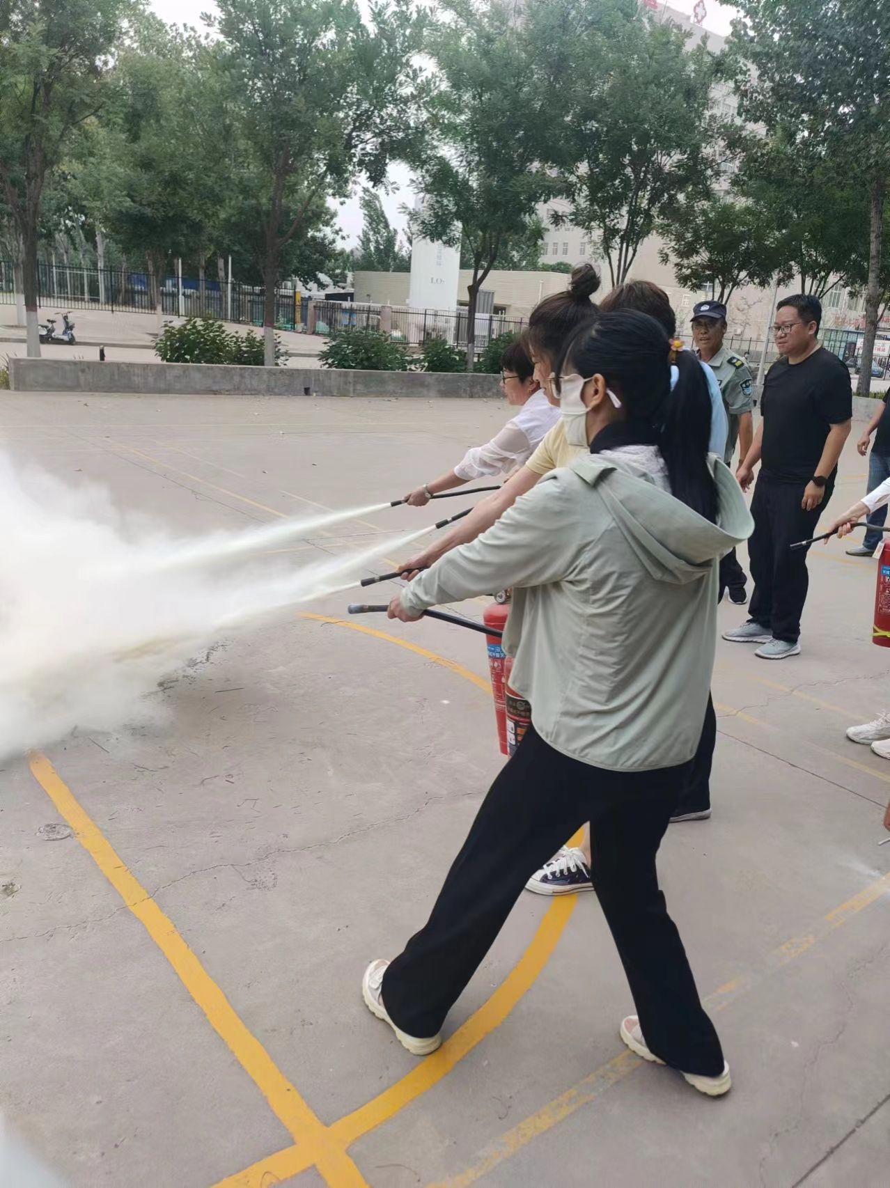 讲座结束后,教职工们一起到室外学习了灭火器实践操作,并进行了火灾扑救模拟演练。