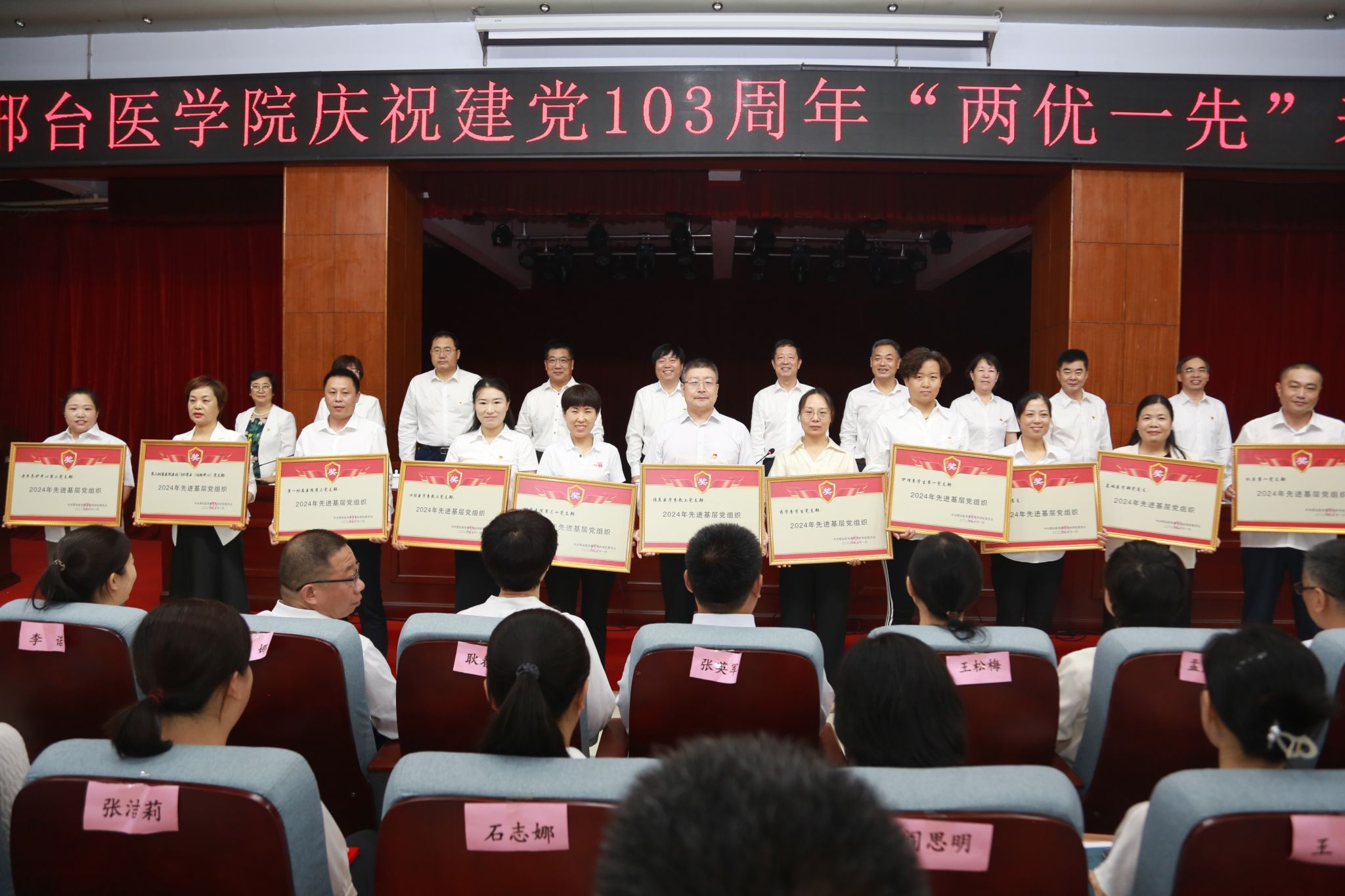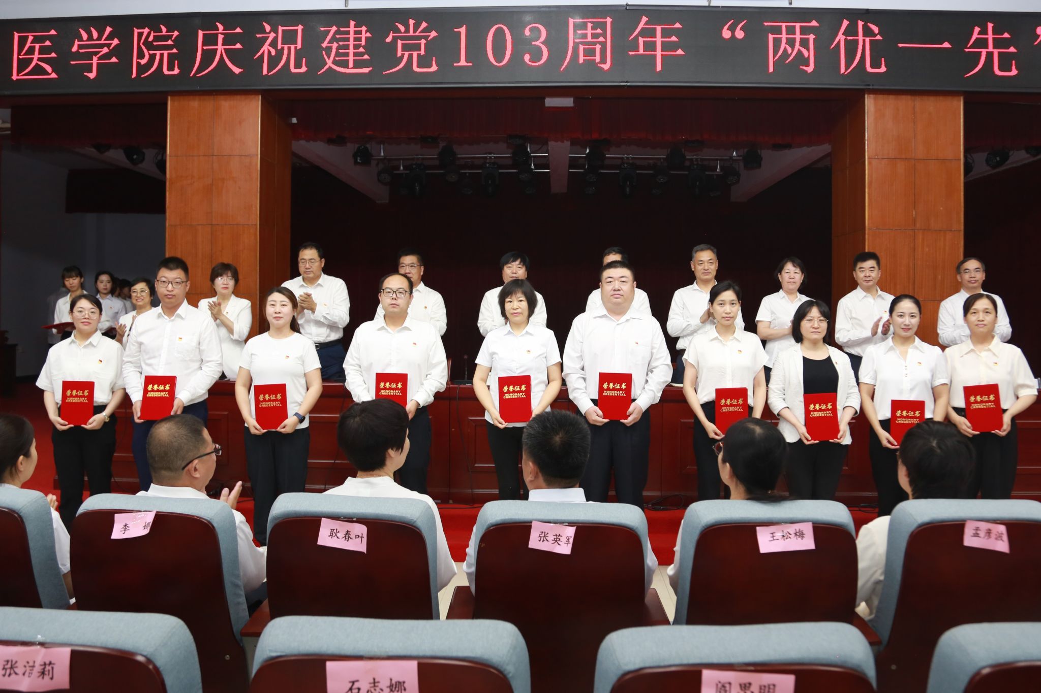 学校领导为“优秀共产党员”代表、“优秀党务工作者”代表和“先进基层党组织”代表颁发了奖匾和证书。