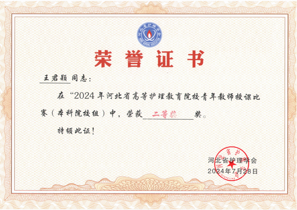近日,由河北省护理学会主办的2024年河北省高等护理教育院校青年教师授课比赛圆满落幕。beat365护理系王君颖老师荣获本科院校组二等奖。这是beat365首次参加该赛事本科院校组的比赛并获奖,标志着beat365护理系本科教学工作取得突破性进展。