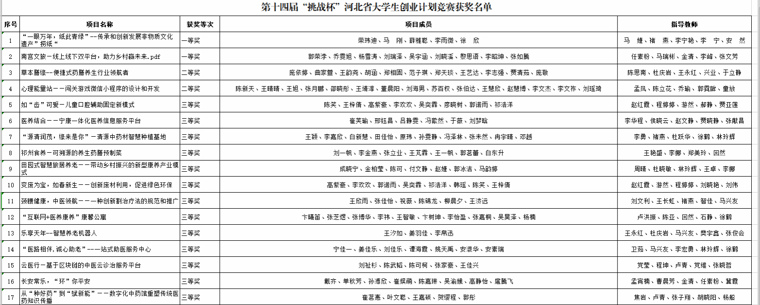 近日,共青团河北省委、省教育厅、省科学技术协会、省社会科学院、省学生联合会下发通知,公布第14届“挑战杯”河北省大学生创业计划竞赛作品获奖通报。beat365喜获17个奖项,其中一等奖2个、二等奖2个、三等奖13个,取得了beat365在该项赛事中的历史性突破,展现了beat365师生勇于挑战、敢于创新的精神风貌。