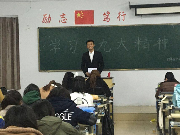 大学生形势政策宣讲团是以大学生为主体的宣讲队伍,通过选拔培养优秀的大学生宣讲员开展进班宣讲活动,增强大学生思想政治教育的针对性和实效性。大学生宣讲员用学生话讲述国家事,他们用自己的语言、自己的视角来学习、宣传十九大精神,改变了传统的宣讲方式,充满了感染力和亲和力。宣讲把十九大精神送进每个班级,送到每个学生的心中,引发了同学们的强烈共鸣,大家纷纷表示,要以个人努力的涓涓细流汇聚成中国梦的江河大海,为实现祖国“两个一百年”奋斗目标贡献青春和智慧。