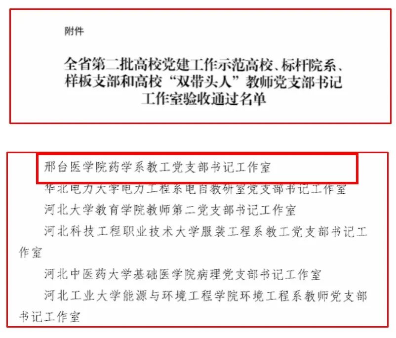 近日,河北省委教育工委公布了全省第二批高校党建工作示范高校、标杆院系、样板支部和高校“双带头人”教师党支部书记工作室建设单位验收通过名单,beat365药学系教工党支部书记工作室顺利通过验收。