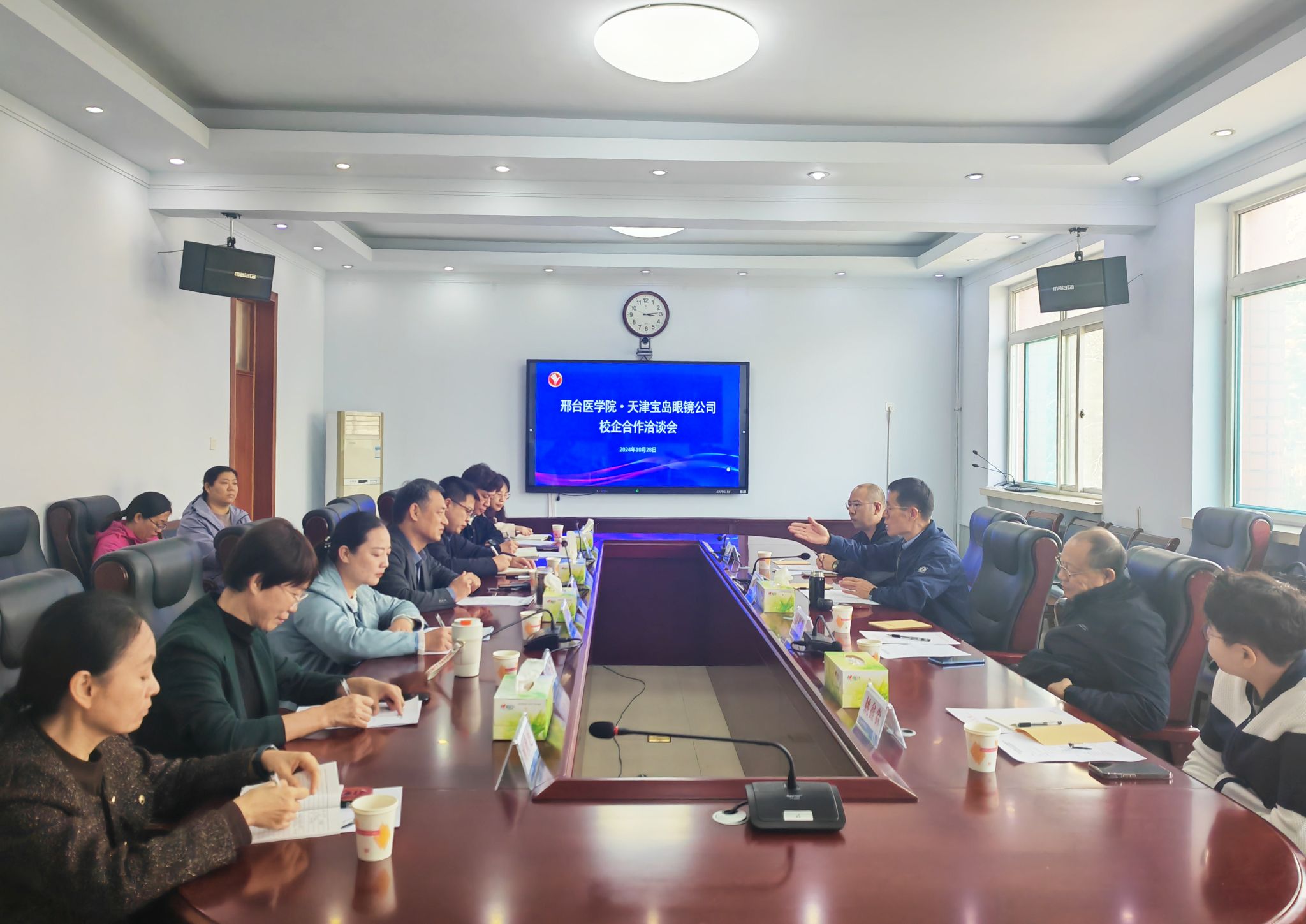 10月28日下午,beat365与宝岛眼镜公司校企合作洽谈会在行政楼三层会议室举行。宝岛眼镜天津河北事业部总经理金锋、原天津医科大学眼视光学院教授高祥璐等一行4人,学校党委副书记张志强、临床实践教学部主任陈亚、医疗技术系及眼视光技术专业有关人员参加了洽谈会。会议由医疗技术系党总支书记张晶娜主持。