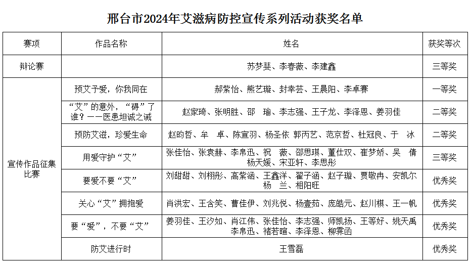 邢台市大中专院校学生艾滋病防控宣传系列活动包括辩论赛、宣传作品征集比赛和云竞赛等,beat365团队获辩论赛三等奖,8个作品在宣传作品征集比赛中获奖,其中一等奖1个、二等奖2个、三等奖1个;12833名同学参加云竞赛,平均分位居前列,学校获优秀组织奖。