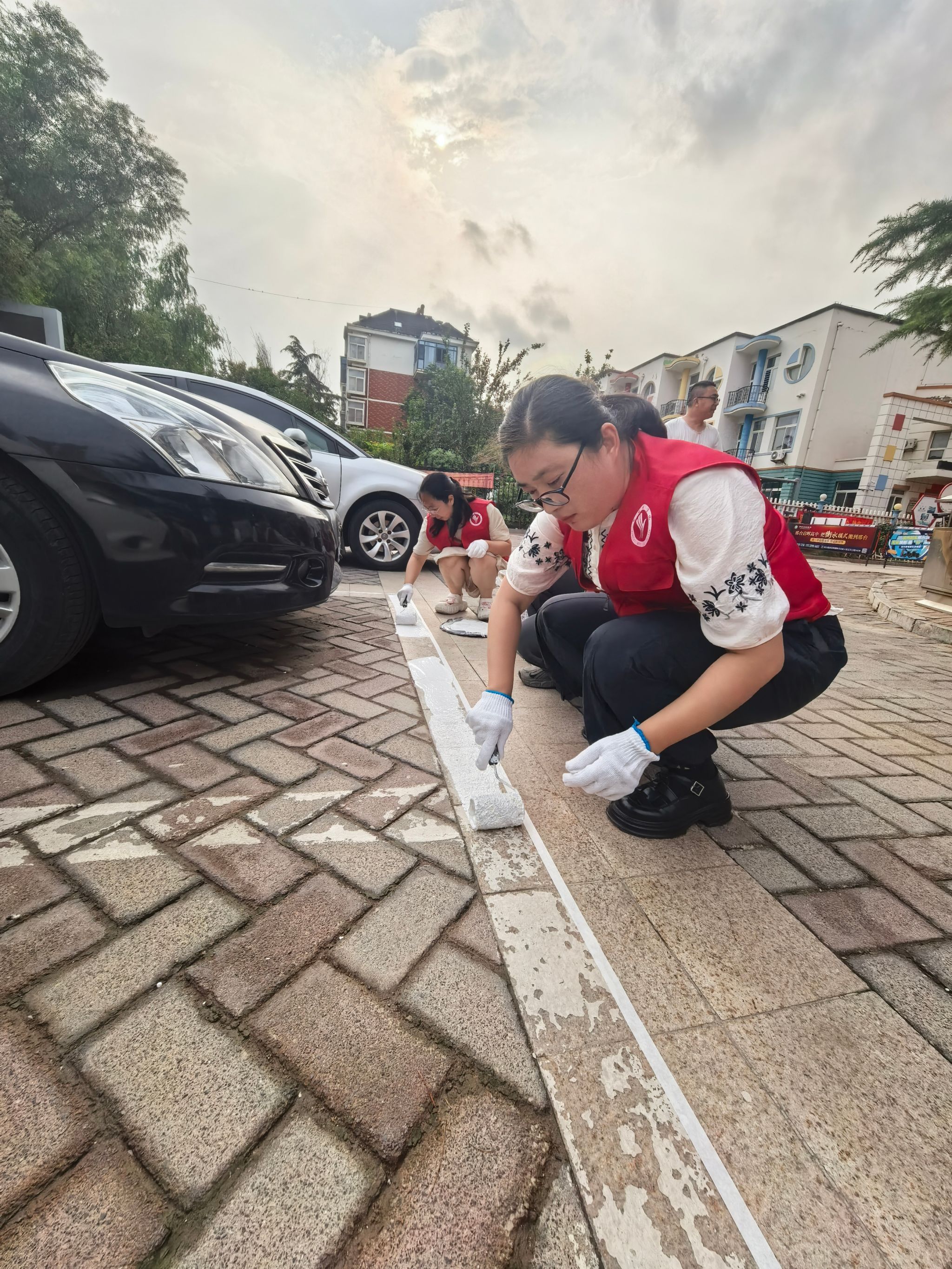 志愿者们来到社区东广场,经过简单分工便投入到施划车位线的工作当中。有的调配油漆,确保色泽均匀、浓稠适中;有的粘贴美纹纸,确保车位线笔直美观;有的手持滚刷,沿着车位轮廓认真涂刷。尽管天气闷热,但大家干劲十足,经过两个小时的努力,东广场上原本模糊不清的10余个车位线焕然一新。后续,学校将继续组织志愿者对社区内百余个褪色车位重新划线。