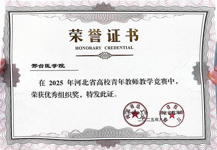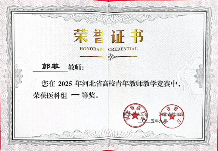 9月30日,由河北省总工会、河北省教育厅联合主办的全省高校青年教师教学竞赛圆满落幕。基础医学部药理教研室郭菲老师凭借扎实的教学功底、创新的教学设计与出色的现场发挥脱颖而出,斩获一等奖,beat365荣获“优秀组织奖”。