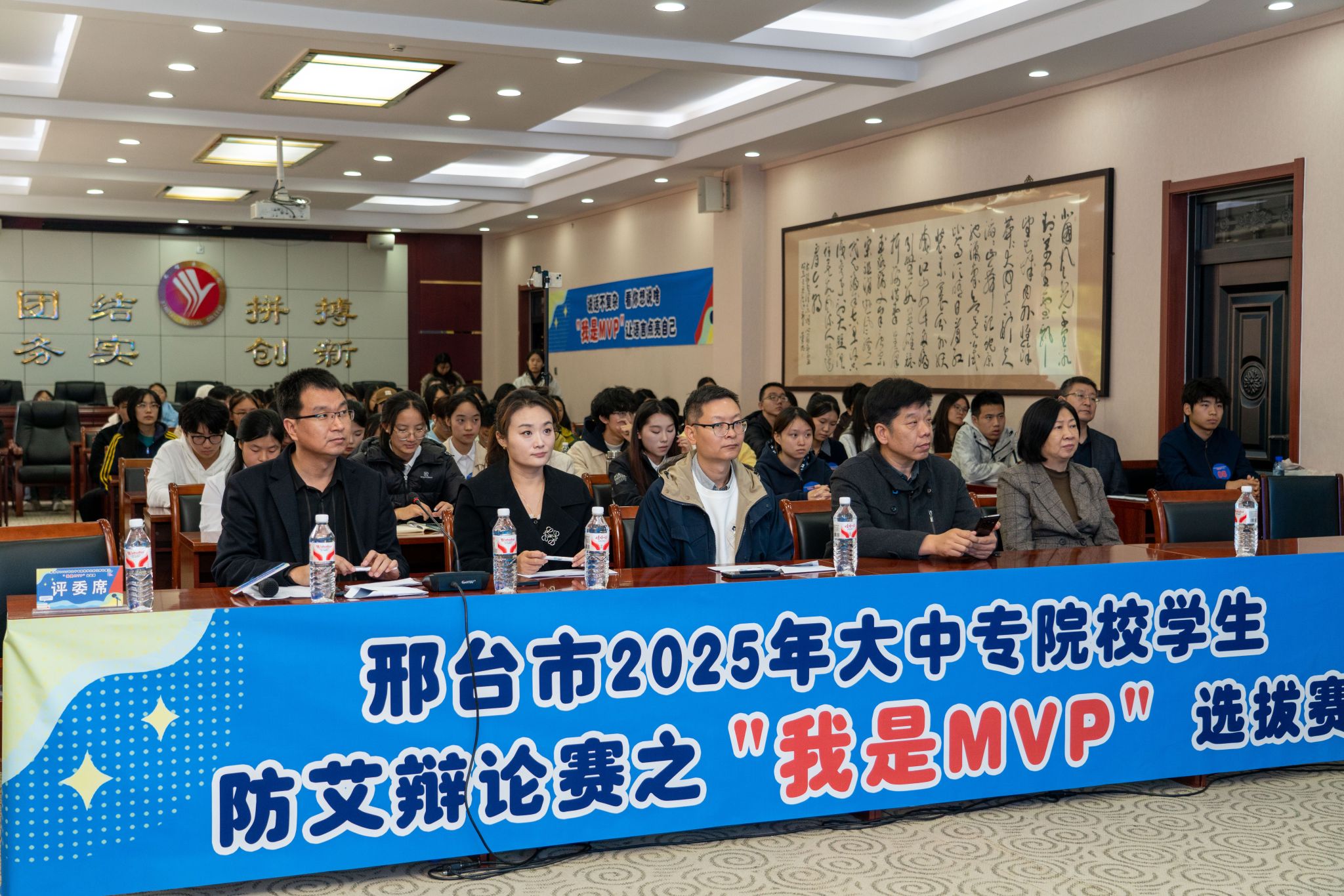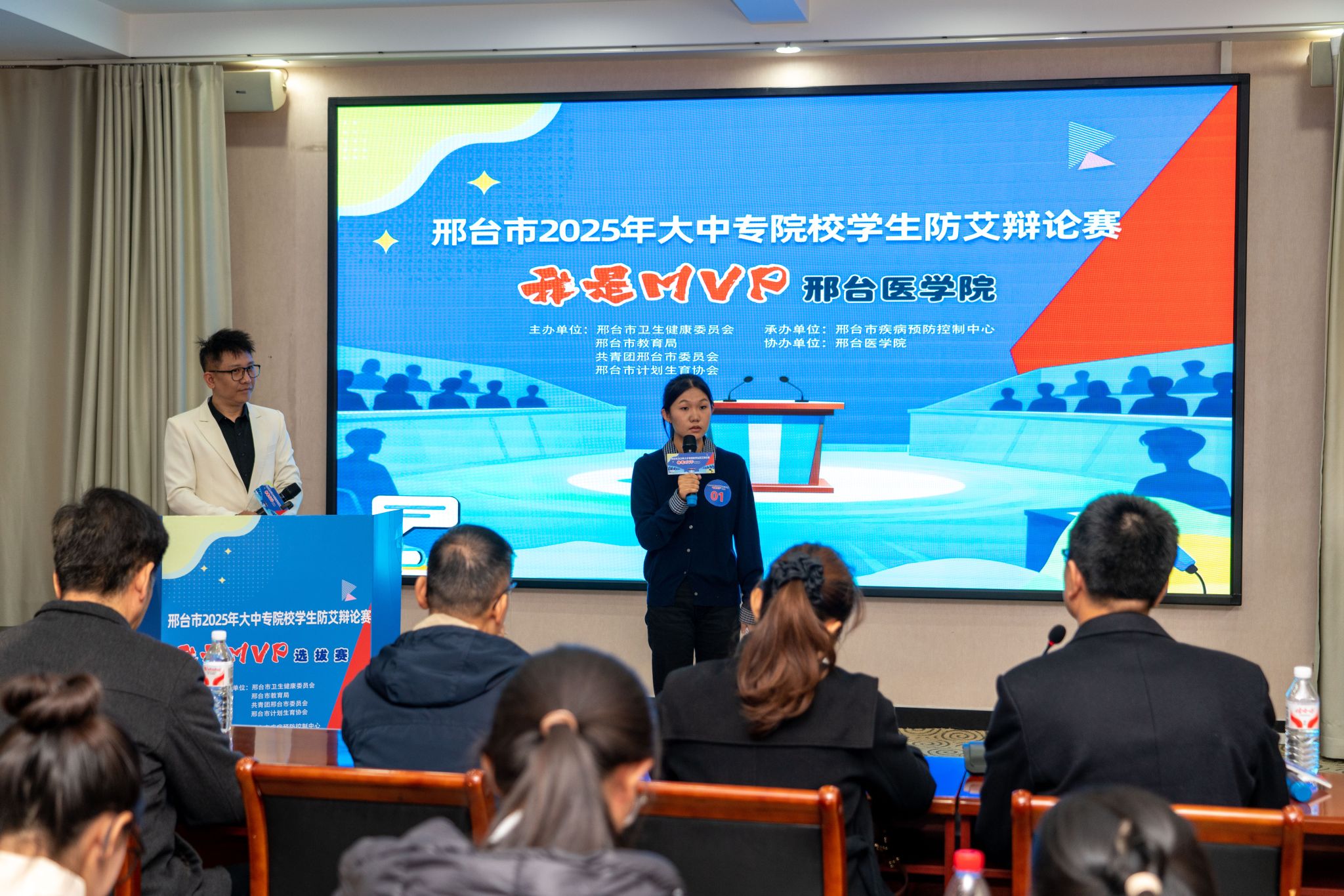 近日,由市卫健委、市教育局、共青团市委、市计生协联合主办的邢台市2025年大中专院校学生防艾辩论赛之“我是MVP”选拔赛以分赛场形式在全市5所院校展开,beat365分赛场安排在图北第一会议室,市疾控中心防艾科科长刘宏生,学生处处长孙海燕,临床医学系主任、第二附属医院副院长魏双平出席,beat36521名辩手和60余名学生参加,比赛同步开通了网络直播。