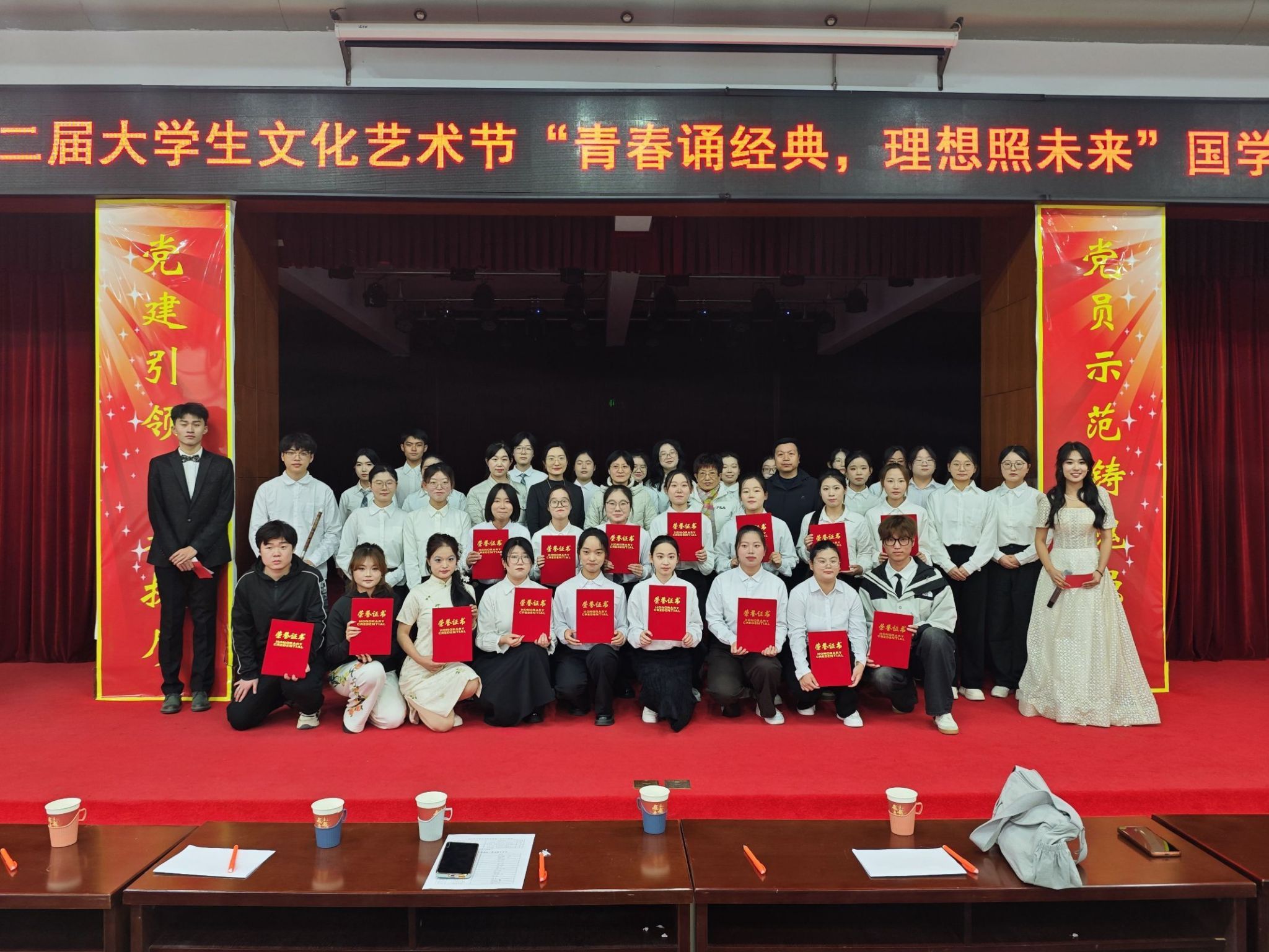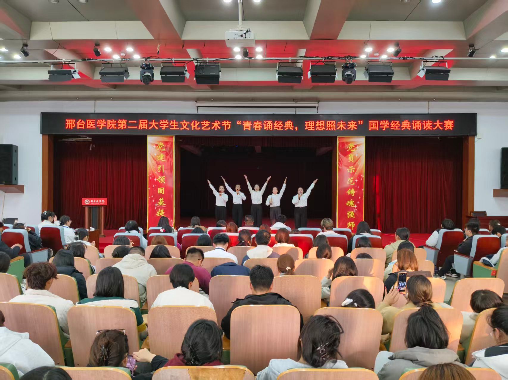 近日,由团委主办、图书馆承办的第二届大学生文化艺术节“青春诵经典,理想照未来”国学经典诵读大赛决赛在学术报告厅隆重举行。团委、图书馆、学生工作处、公共教学部等部门相关负责同志以及300余名师生参加。