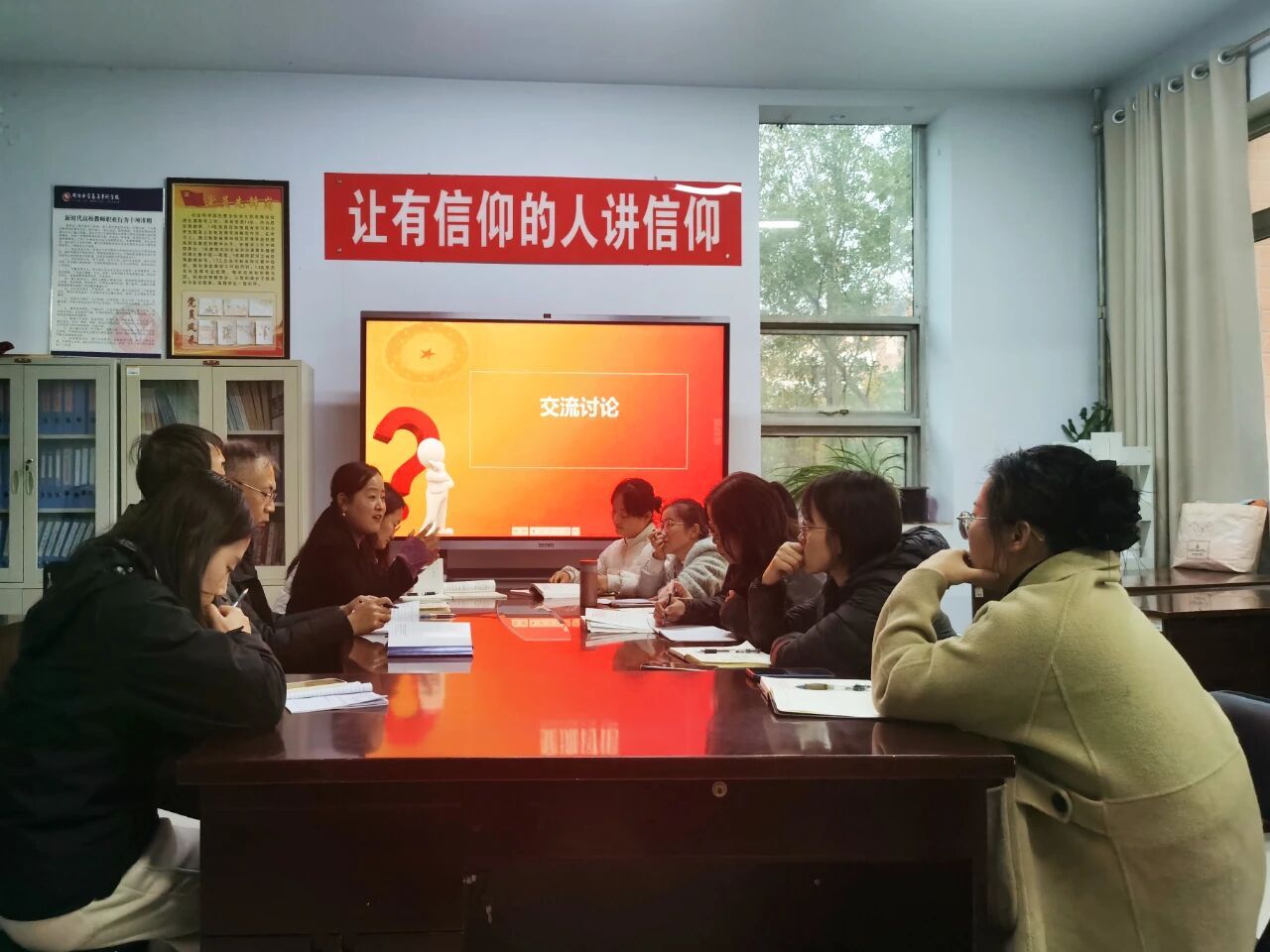 主讲教师张文芳在说课中系统阐述了《毛泽东思想和中国特色社会主义理论体系概论》课程第四章《社会主义建设道路初步探索的理论成果》课程逻辑结构、理论内涵与学生实际相结合的授课思路。与会教师围绕教学材料搜集、重难点突破、教学方法运用等展开了深入交流与研讨,主题明确,氛围融洽。