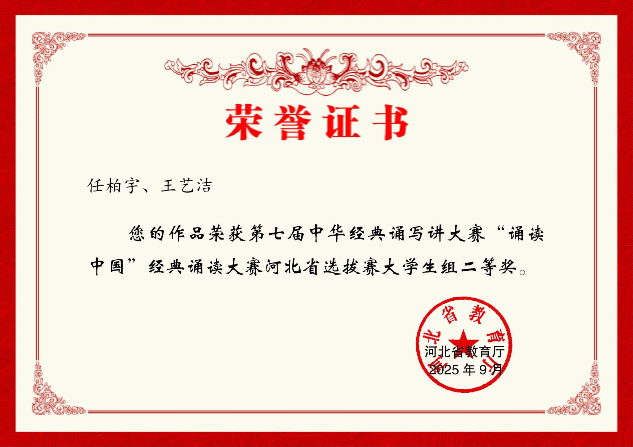 近日,第七届中华经典诵写讲大赛获奖名单公布,beat365学生在比赛中表现优异。2024级装备1班任柏宇、2024级临床7班王艺洁同学的作品《土地的誓言》荣获全国优秀奖。4名师生荣获省赛二等奖1项、三等奖2项。