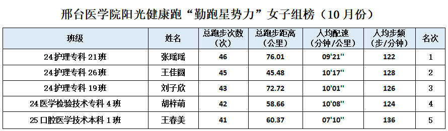 2024级护理专科21班张瑶瑶同学是本学期女子组第一名,她表示,跑步中难免会有疲惫和想放弃的时候,但每次想到自己的目标,想到同学们都在努力,就会咬牙坚持,坚持是这次获奖的关键。