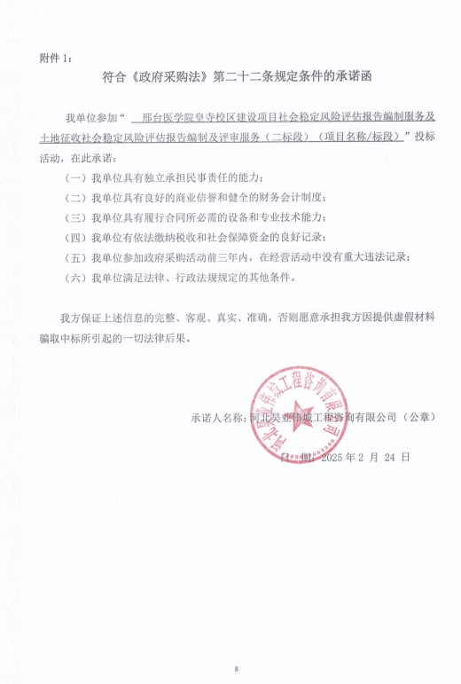 河北昊业伟城工程咨询有限公司 | beat365平台官方网站皇寺校区建设项目社会稳定风险评估报告编制服务及土地征收社会稳定风险评估报告编制及评审服务二标段 | beat365平台官方网站皇寺校区建设项目土地征收社会稳定风险评估报告编制及评审服务;完成beat365平台官方网站皇寺校区建设项目502亩及108亩用地的土地征收社会稳定风险评估报告编制及评审服务,满足相关行政审批部门要求及征地组卷、建设用地报批需求。 | 合格,符合国家或行业现行标准要求 | 合格,符合国家或行业现行标准要求 | 合同签订后3日历天内完成 | 116000元 |